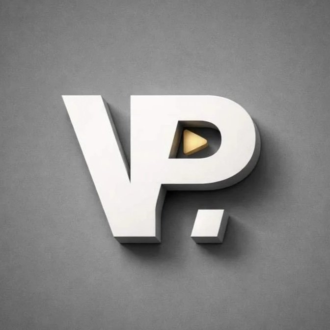Een 3D-tekst 'VP?' op een grijze achtergrond, met een klein geel filmknopje binnen de letter 'P'.